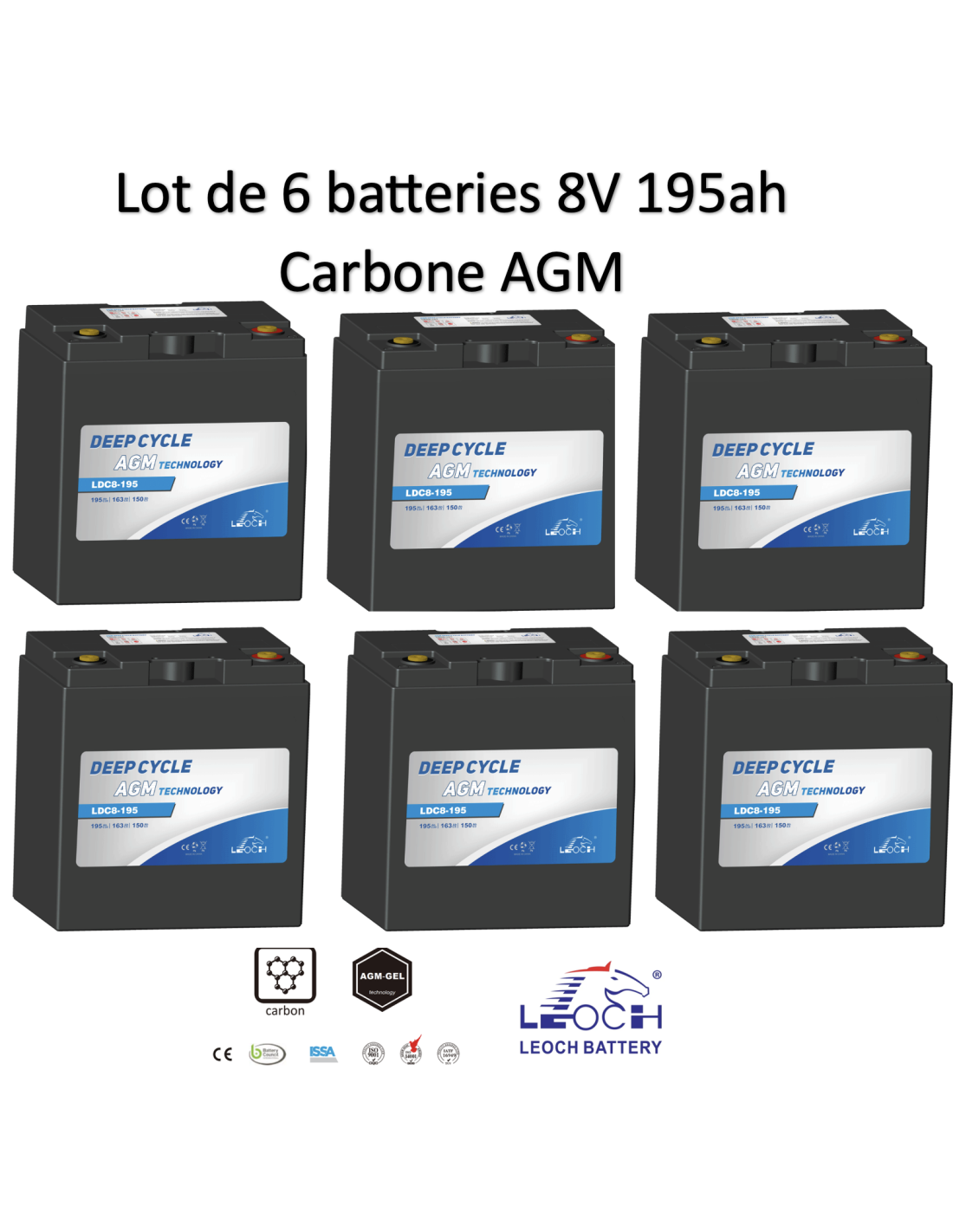Batterie Leoch Carbone AGM/GEL 8V 195ah Pour Nacelle, voiture de gold, golfette, véhicule électrique Dimensions 262x180x279mm Poids 33,6kg